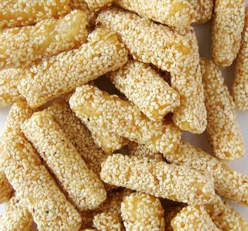 贵阳青岩麻片糖原料:糯米、小麦、芝麻、核桃仁、沙糖、玫瑰花蜜饯、引子等。使用一些玫瑰花来切碎,加入(碗儿糖)舂成密饯,用陶钵装上在太阳下晒干。然后用糯米和小麦制成麦芽糖稀,加上芝麻、核桃仁、沙糖和玫瑰花蜜饯,搓均后切成薄片或长条,这就成了香甜酥脆的有玫瑰香味的麻片糖。