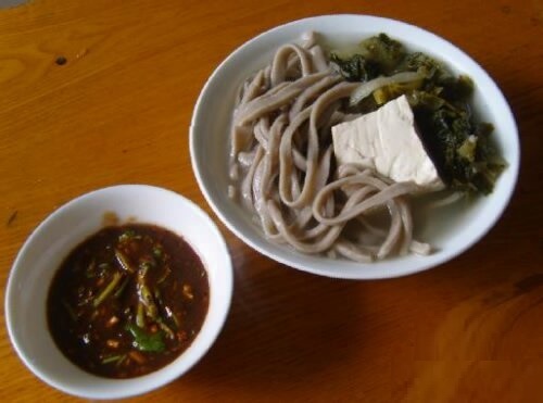 4.把煮好的酸菜放在碗底,再放上烫煮过的豆腐块,然后把荞面条煮好捞在放有酸菜和豆腐的碗中,蘸着蘸水食用。
