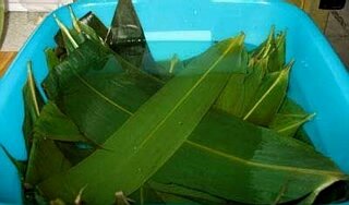 4,蒸锅加水放入新鲜粽叶,待水烧开放上烧麦笼大火蒸10分钟即成。