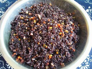 2,炒锅下花生油烧六成热下姜末炒香,下广味香肠、胡萝卜、香菇丁炒出油加入已蒸熟的黑糯米和适量清同炒片刻,加入精盐、味精、胡椒面调味制成烧麦馅。