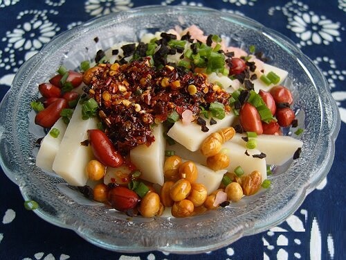 3.食用时把胡豆凉粉翻倒出来放在案板上,切成细长条装碗,加入油炸花生米、油炸黄豆、酸萝卜丁、黑大头菜丁、盐菜丁、葱花、