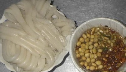 3.食用时翻倒出来放在案板上,用特制的刮子把荞凉粉刮成细长条装在盘子里,用另一小碗放入酥黄豆、酸萝卜丁、黑大头菜丁、芜