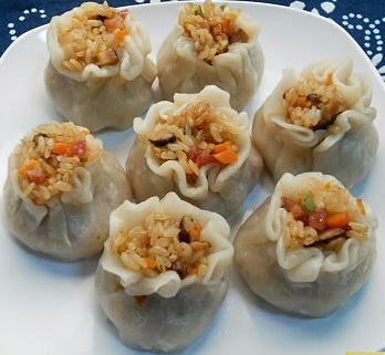 5、烫面擀制成面皮包入糯米馅料,制成烧麦。