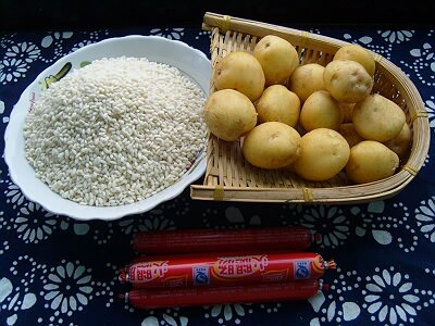 都匀土豆糯米饭用料:糯米750克,火腿肠200克,新土豆400克,花生油50克,精盐10克。