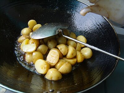 2,炒锅加油烧至6成热下土豆块炒五分钟,加入精盐、酱油炒匀调味;