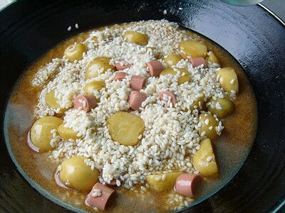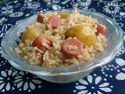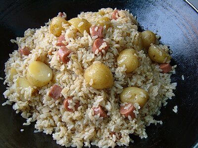 加入糯米、火腿肠,清水200克,用锅铲将火腿肠、土豆、糯米翻匀,大火烧沸,盖上锅盖改小火焖20分钟至收水即成。