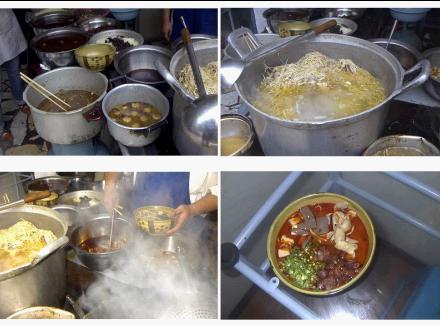它的主要原料是猪大肠、新鲜的猪血旺和擀制的鸡蛋面条。配料和调料有20多种。主料和配料的制作都非常考究。猪大肠越肥越好,里外洗净,用盐、醋反复揉搓,将肠壁的粘状物揉净,再用清水反复浸漂,除去腥味。然后放在木盆或瓷瓦盆中(忌放金属器皿内),把肠子花椒、山奈、八角放入锅内煮熟,捞出切成片。然后又用姜、葱、山奈、八角放入砂锅小火慢炖。血旺要嫩,也切成片吃时在汤锅里放一下。配料如脆哨即用猪糟头肉或五花肉,用以鸡蛋面、猪肠、血旺、脆哨四大原料为本,再调放鸡汤、红油辣椒等佐料,经12道工序,才出成品一份。其汤色鲜红、面条蛋黄、肥肠粉白,葱花嫩绿,豆芽金黄,一碗捧出,使人顿感赏心悦目,待举箸下咽,更是满口生香。面条脆细爽口、食不粘牙;肉哨香脆、肠旺鲜嫩;辣而不猛、油而不腻;汤鲜味美、回味悠长。
