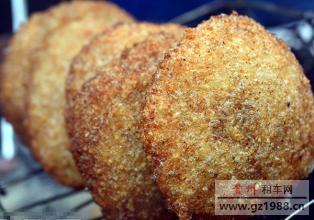 油炸糯食,安顺清早街头巷尾都有卖,一张桌子,架一油锅,现做现炸,人们老远就闻到浓浓的糯米香,路人走上前丢2.5元钱拿起一个边走边吃,也有买了回家当早餐。外脆里糯,喜甜爱咸都可得到满足,吃完满口留香。