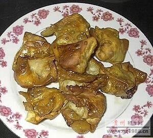 安顺鸡肉香煎馄饨:鸡肉馄饨平底锅煎熟来吃,由于鸡肉鲜嫩很容易煎熟,油煎馄饨具有馅鲜软嫩,外壳酥脆的特点,也不失为一种特别爽口的美味小吃。