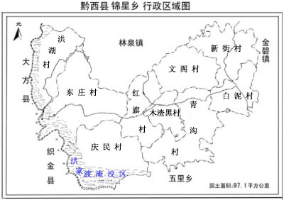 (安顺黔西县锦星镇) 锦星镇位于黔西县西南部,地理位置为东经105°45′30″~105°57′15″,北纬26°55′45″~27°15′20″之间,乡域从东到北依次与金碧镇、五里乡、织金县、大方县、林泉镇接壤,乡域南北宽7公里,东西长14公里,总面积97.1平方公里,耕地面积20183亩,其中田8664亩,辖9个行政村62个村民组,现有总户数7232户,共30729人,其中农业人口29909人,非农业人口820人,少数民族4878人。