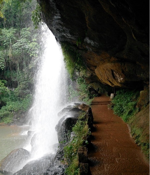 继续往前走,经过通幽门、猴飞岩、仙风洞等景点,走到底就是赤水大瀑布了。壮美的瀑布倾泻入潭水,溅起的水花晶莹剔透,发出的瀑布声轰鸣震耳,运气好的话在阳光下还能看到彩虹。攀上潭水中的巨石,则能近距离感受瀑布。