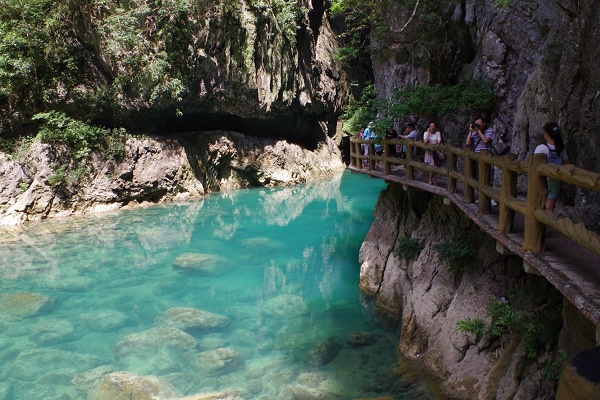 舟行约2公里,有高60米、孔宽20米的天生桥矗立于花草树木丛中,一道奔腾不息的瀑布映衬上面的"桥"身,静中生动,静内出声。过天生桥,地下湖又是一番神秘,使游人惊喜不已。