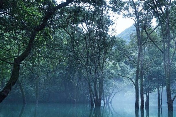 潭边怪石奇树林立,古木森森,潭外水声轰鸣,雾雨蒙蒙,四周高山紧锁,水潭犹如地底深渊,即便是发洪水时,潭面也犹如镜子般平静。