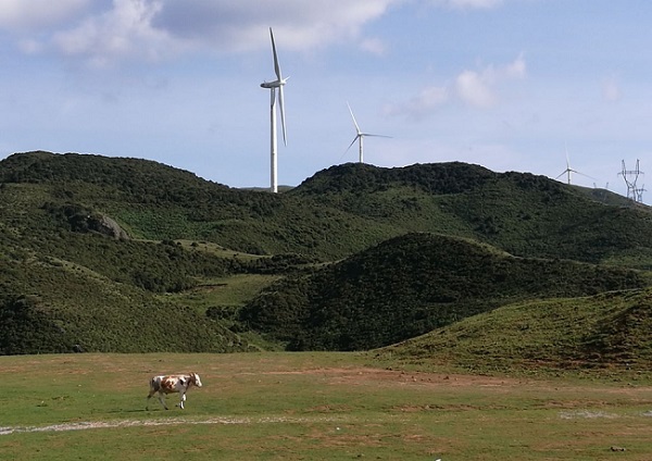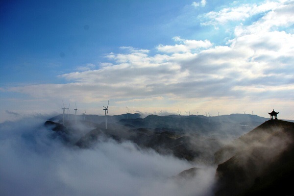 当你登顶之后,你就站在了安顺之巅,这里景色独好:远方有高大的风车和蜿蜒的公路,头顶有蓝天和白云。