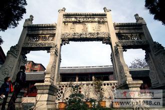 府文庙共有四进。第一进分上下两院。由于就坡而建,四进建筑物也随之升高。入得文庙正门至第一院落,内有半月形水池,称为泮池。在古代,凡中秀才得从石桥上过,名“游泮”。 第二进大院东西两端,分别建一幢单间重檐歇山顶亭阁,称“桂香阁”,“尊经阁”。是祭祀时张榜公布祭孔官员名单处。 第三大院,是由正殿(大成殿)、两庑和大成门合围而成的一座四合院。两条石龙宛如从天而降,龙身时隐时现,龙首遥相呼应,栩栩如生。柱础石狮为雌雄二狮,雄狮足蹬绣球,雌狮怀哺幼狮,口含铜铃。它们与大成门外的另两根石龙柱,同被称为“文庙四大石雕瑰宝”。