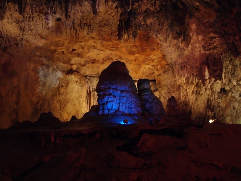 第三厅是霸王厅。景观有霸王盔、霸王鞭。它们是由于滴水量,碳酸钙浓度、温度以及环境气候的变化,滴水的盔形石笋上再次堆积形成戟状石笋。它们的形态充分显示了洞穴发育的阶段性。