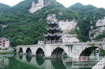 为七孔青石拱桥。桥中央有一个三层三檐八角攒尖顶楼阁建筑,被称为"状元楼"、"魁星阁"。据说此楼建成十年后,安顺果然破天荒地出了两个状元。