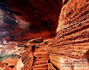 以红色蜂窝状的丹霞壁画石刻长廊为特色景观,那如佛、如蛙、如龟等各种奇形怪状、千姿百态的红河与桫椤、茂密的竹林、清澈见底的溪泉瀑布,仿佛把人带到原始、自然、幽静的侏罗纪时代。