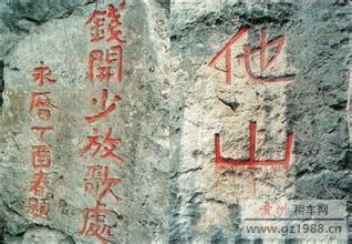 旁即他山,回曲斜抱,上多奇石,有的酷似六畜。山上崖刻“他山”、“玉屏洞天”、“藏书筐”、“梅仓”及“明少保钱开少放歌处”等字,至今犹存。