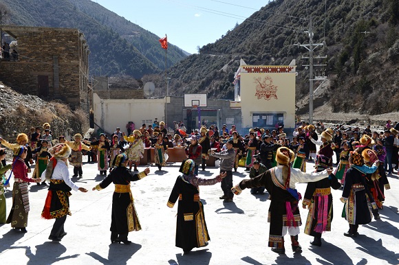 锅庄舞,表演时无任何乐器伴奏,场地选择在锅庄房或院坝,男女自成两排,围圈携手共舞。主要分为大锅庄和小锅庄。大锅庄属礼仪性舞类,多为寺庙念冬经或迎宾时跳。小锅庄属自娱乐性舞类,不拘形式,随时随地都可以跳,锅庄房、院坝里,甚至劳动场所。