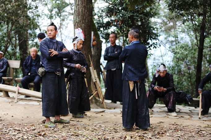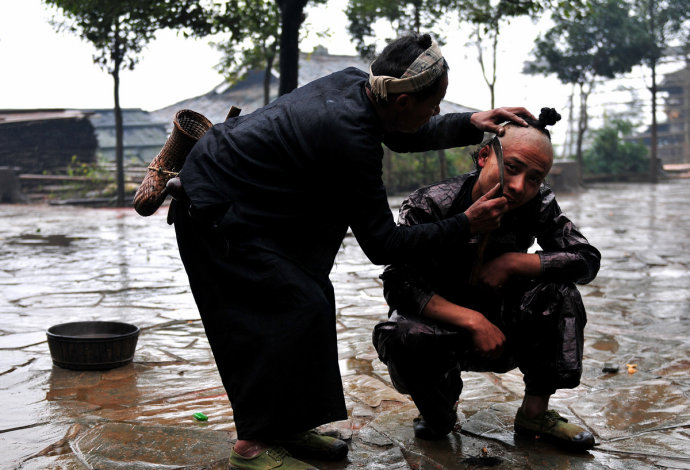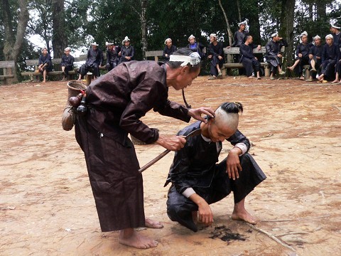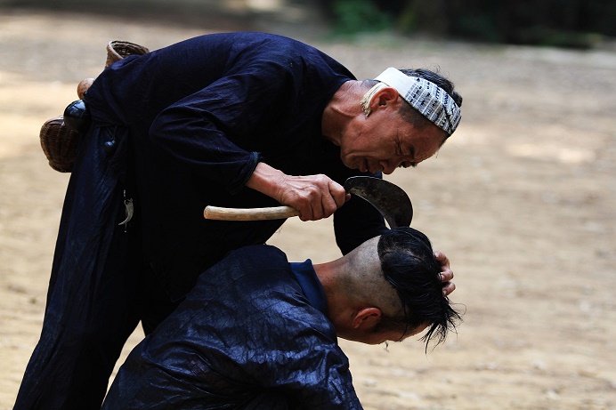 发髻盘于头顶,四周头发则被剃光。更令人叫绝的是,村子里的理发匠是用割草收禾的大镰刀为全寨子的男人剃头的,用刀锋与刀柄呈90度角的大家伙在人头上舞弄,且技艺娴熟到想留哪就留哪、想剃哪决不留下丝毫发茬的地步,脖子、耳后的头发全部剪光,其主要形成原因是岜沙人古老而朴素的树崇拜生态观念。